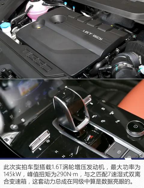 实拍车型搭载1.6T涡轮增压发动机并匹配7速双离合变速箱,发动机最大功率145kW,最大扭矩290牛·米。据悉未来还会有搭载1.5T发动机+48V轻混动力系统的车型登场。