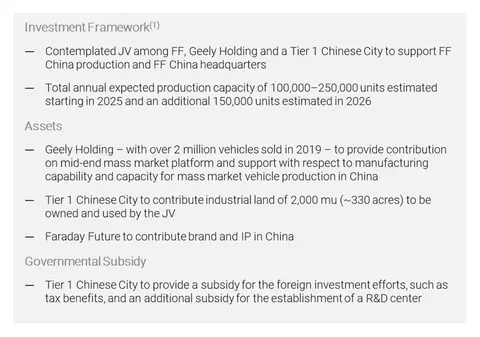 不过,文稿写道,截至该演示文稿发布日,对于合资公司未有明确文件达成,因此合资公司有可能会设立,也可能与描述有所出入,并不确保FF、吉利和该一线城市定会成立合资公司。