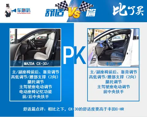 舒适度方面,CX-30的整体表现会优于C-HR一些,电动座椅记忆功能是CX-30比C-HR多出的一个实用功能。