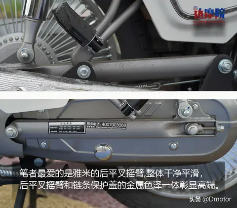 笔者最爱的是雅米的后平叉摇臂,整体干净平滑,后平叉摇臂和链条保护盖的金属色泽一体彰显高端。