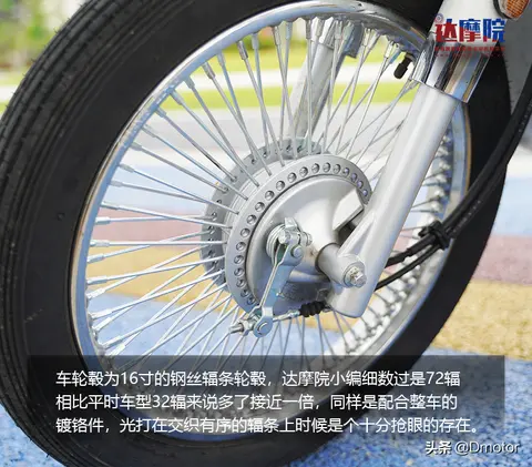 车轮毂为16寸的钢丝辐条轮毂,达摩院小编细数过是72辐,相比平时车型32辐来说多了接近一倍,同样是配合整车的镀铬件,光打在交织有序的辐条上时候是个十分抢眼的存在。