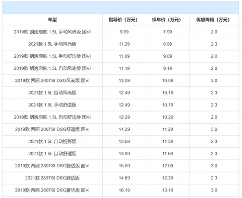 最后在动力上,朗逸提供1.2T、1.4T和1.5L三种排量可选,传动则是匹配的5挡手动、6挡手自一体和7挡双离合变速箱。此外,朗逸在售的有两厢版、三厢版以及启航版(老款)等多款车型,价格方面也是参差不齐。就以目前优惠最高的2019款朗逸两厢版车型为例,在苏州地区新车可以优惠3万,相当于打了7折,优惠力度还是蛮大的。结合其它车型也有2万的优惠,所以综合性价比挺高。