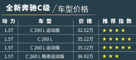 此外,如果你想购买奔驰C级的立标版本,就只能选择35.12万元的版本,这是目前全系唯一一个提供立标外观的配置。综合动力、差价、配置算下来,35.12万的C 260 L是我们最推荐购买的,综合推荐指数5颗星!