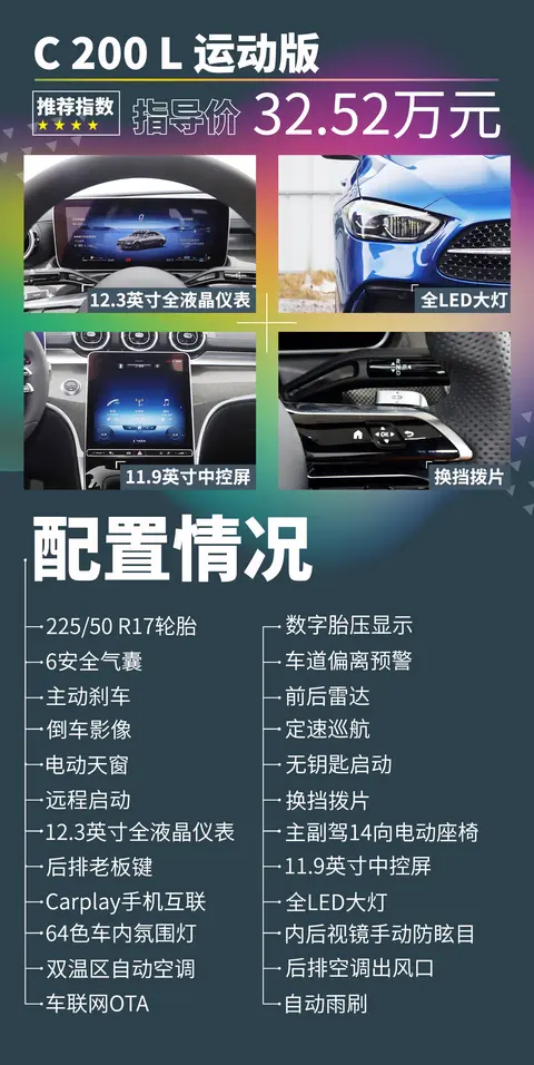 从基础的配置来看,C 200 L运动版并不寒酸,12.3英寸液晶仪表+11.9英寸竖向中控屏、64色氛围灯、皮质方向盘、皮质座椅、自动空调、倒车影像、主动刹车、换挡拨片这类配置都是标配,即使是买最低配车型,在内饰的豪华氛围上也是完全不掉价的。