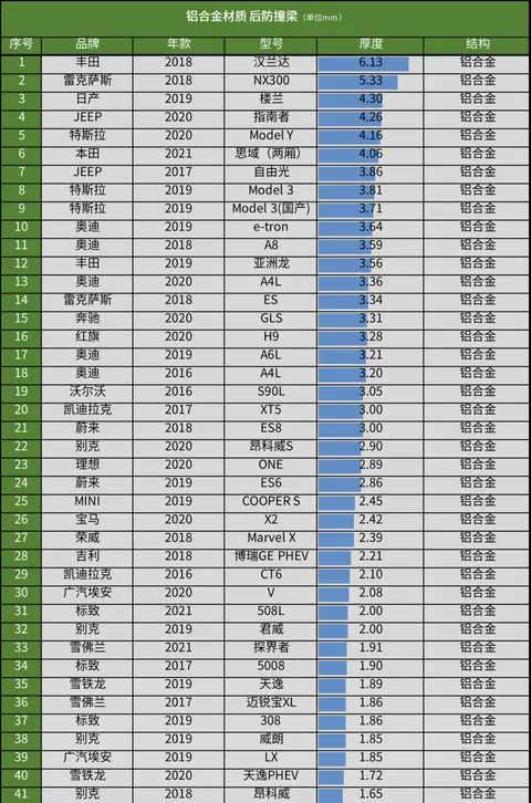 最令人意外的是,副防撞梁后方还有一根铝合金防撞梁,截面呈“日”字形结构,厚度达到了5毫米。也就是说,这辆车的车头部分有三根铝合金前防撞梁!