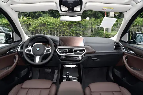 内部看开,2022款宝马X3的内部也整体偏向运动设计。运动式三幅式真皮方向盘设计新颖,能够上下+前后方向调节,M曜夜套装版本车型提供方向盘换挡配置;车内材质应用方面,有软质材质、木纹装饰板,并在出风口、门把手等有镀铬亮条加持,增加了精致感和豪华感。