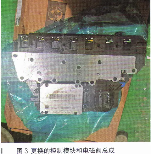 路试车辆,一切似乎又是正常的,并没有出现客户所述故障现象。压力控制电磁阀5控制的是C1234挡离合器的工作,结合故障现象是有时车辆不爱走车,而变速器控制模块又设置了压力控制电磁阀卡滞的故障码,路试时故障没有再现,变速器的硬件部分应该没什么问题,所以推论大概是电气元件也就是压力控制电磁阀5偶尔出现卡滞导致了故障的出现。不同于GF6第一代变速器,在维修市场上并没有单独的电磁阀供应,所以要想更换压力控制电磁阀5只能更换控制模块和电磁阀总成。