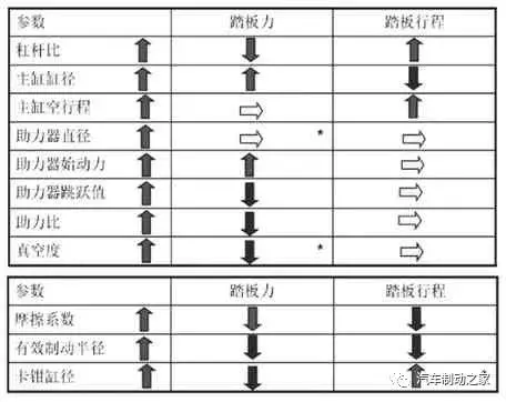 根据测试的标杆数据,明确设计车型制动系统的性能指标,主要包含0.2g、0.5g、0.8g、1.0g减速度时制动踏板力、制动踏板行程、减速度的以及百公里的制动距离等,制动踏板影响因素如图3所示。