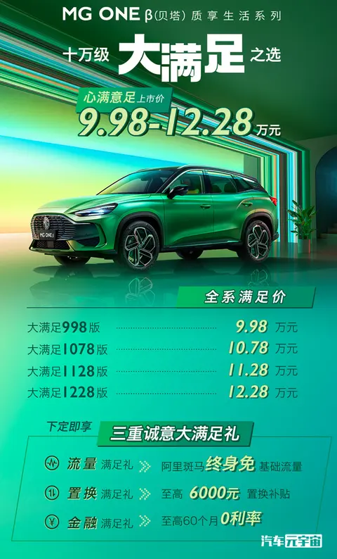 3月28日,上汽名爵全新SUV MG ONE β版上市,共推出4款配置车型,售价区间为9.98-12.28万元,起售价相比α版便宜8,000元。目前下定可享三种满足礼,包含阿里斑马终身免基础流量、至高6,000元置换补贴和至高60个月0利率。新车基于上汽SIGMA架构打造,整体尺寸相比长安UNI-T更大,动力搭载1.5T+CVT动力总成。