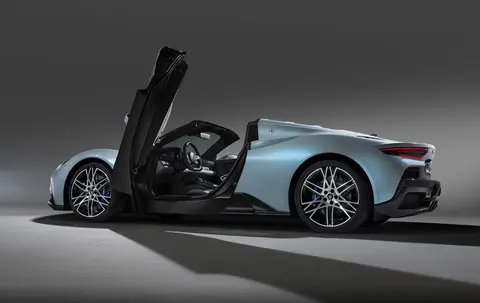 外观设计方面,新款玛莎拉蒂MC20敞篷版与硬顶车型的设计几乎一致,大灯采用纵向布局,LED日行灯造型别致,配以椭圆形开口的前格栅设计,像是一头还未完全长大的鲨鱼。此外,作为一款超级跑车,轻量化设计必不可少,前包围采用碳纤维材质打造,两侧还配有通风口,蝴蝶门设计不仅看起来华丽,也能让驾乘人员进出座舱更加方便。