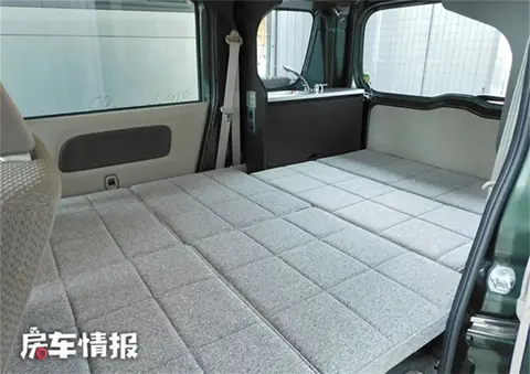 需要休息时,要将后排座椅放倒,垫子铺满整个车厢,这样就有了一个尺寸约为2000*1400mm的双人床,厚实的床垫,让这张大床躺上去十分舒服,在这里小车里也可以尽情享受睡眠了。
