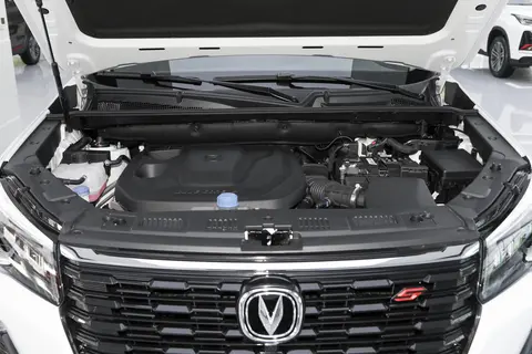车尾部分最上方依旧是一个鲨鱼鳍天线搭配大尺寸后尾翼,中间镶嵌着高位刹车灯,中间长安车标搭配贯穿式尾灯组,最下方采用黑色包围贯穿着双边共双出的排气装饰,整个车尾看起来比较大气。