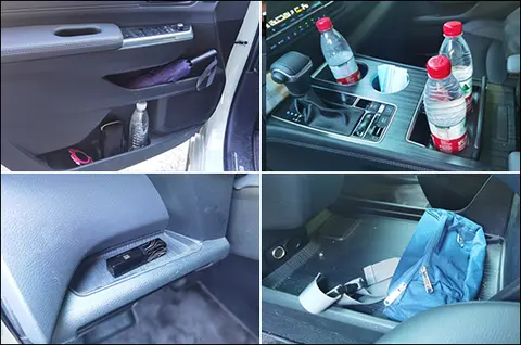 对于车内使用空间的测试,只针对前排触手可及的空间,不包括手套箱、中央扶手箱等需开启的空间。测试方法是将以下固定物品全部放置在前排的各个储物空间内,通过固定物品的放置情况来判断车辆储物空间的表现。测试选定的固定物品为:2瓶常规大小的矿泉水、1部大屏手机、1支口红、1个挎包、1副墨镜、1把折叠雨伞以及1包常规尺寸的抽纸。