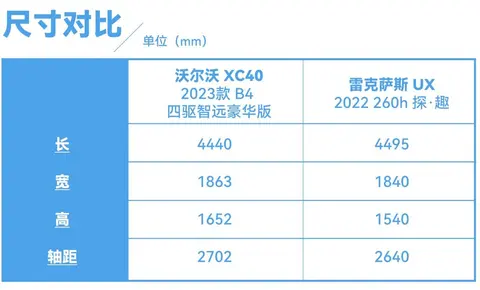 车身尺寸方面,雷克萨斯UX 2022款 260h探·趣的长宽高分别为4495*1840*1540mm,轴距2640mm;沃尔沃XC40 2023款 B4 四驱智远豪华版的长宽高分别为4440*1863*1652mm,轴距2702mm。长而低的设计让雷克萨斯看起来更加时尚,而沃尔沃比雷克萨斯略高和长的轴距又保障了其车内空间表现。