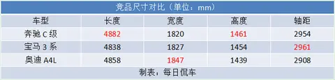 车身尺寸长宽高分别为4882/1820/1461mm,轴距为2954mm。虽然轴距比起宝马3系长轴距版略短,但整体长度超过了后者,高度也是三者中最高,体量感更足些。