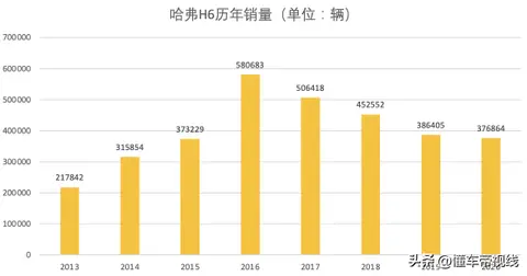 2017年全年,哈弗H6的销量是506418辆,同比减少12.79%;2018年,哈弗H6的销量是452552辆,同比减少10.6%;2019年,哈弗H6的销量是386405辆,同比减少14.61%;2020年,哈弗H6的销量是376864辆,同比减少2.47%。