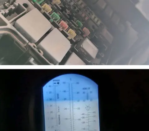 接下来拿出电瓶检测仪、刹车油笔、防冻液检测仪,分别检测油电液是否在最佳工作状态。可以看到蓄电池是更换过的,刹车油、防冻液都在最佳工作状态,入手后可以开一段时间再考虑是否做保养,当然了,如果不差钱的话最好是当月内就把油水就换一遍,以便记录爱车的保养周期。