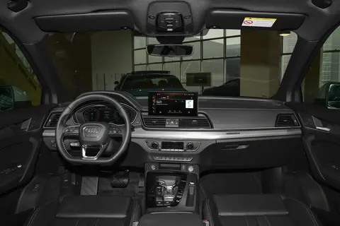 奥迪Q5L Sportback中控台上方采用大面积软质材料包裹,下方仪表盘采用一块12.3英寸全液晶仪表搭配真皮包裹的多功能方向盘,中间一块悬浮式10.1英寸的中控屏,整个内饰科技感营造的不错。