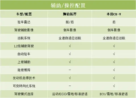 在辅助/操控配置方面,两车均配备了后驻车雷达、倒车影像、全速自适应巡航、L2级辅助驾驶、自动驻车、上坡辅助、发动机启停技术以及ECO/雪地/标准舒适驾驶模式。不过狮铂拓界还多出了前驻车雷达和运动模式,并提供车侧盲区影像和360°全景影像的选配,相对人性化一些。而本田CR-V则多出了陡坡缓降和可变转向比系统。