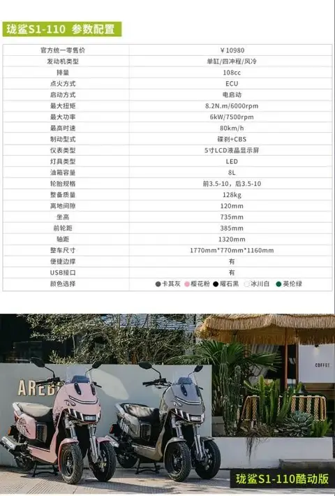 珑鲨110配备的是实际排量108cc卧式单缸风冷发动机,最大功率6kw/7500rpm,最大扭矩8.2N.m/6000rpm。虽然是110的发动机,但账面参数一点不弱,高度接近主流125踏板动力(巧格125参数为6.1KW\6500rpm,9.7N.m/5000)。
