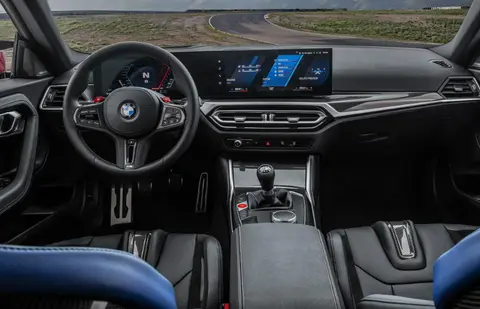 在内饰方面,迟迟改款的宝马M2同样是采用了时下常见的一体式双联屏布局,虽然是一个比较流行的设计风格,但是也似乎不是一件新鲜事了。不过,相比老款来说确实是得到了质的提升,无论是豪华运动感还是时尚科技感,都得到了改善,同时再加上一体式Alcantara材质的运动座椅,更是进一步的提升了整车的豪华感与运动感。除此之外,它的前排座椅具备了头枕调节功能、腰部支撑以及腿托调节功能,从而进一步提升了驾乘舒适性,第二排座椅还支持40:20:40比例的座椅放倒。