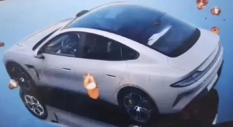 车身侧面,新车侧身线条十分流畅,并且C柱位置有几分溜背设计,从侧后45度看过去非常漂亮。另外,新车门把手采用隐藏式设计,有利于减少风阻。轮辋部分采用五辐式花瓣轮胎,造型比较漂亮,此外还能看到黄色刹车卡钳。车顶能看到该车采用了大面积的全尺寸天窗,采光效果良好,但是隔热隔紫外线能力尚不得知。车尾部分,新车采用贯穿式尾灯设计,下保险杠以及左右侧组件造型尚不得知。