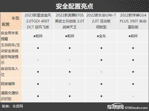动力小结:根据对比我们不难看出,四款车型在动力方面差距并不是很大,均属主流水平。相对而言,星途追风、长安UNI-T以及传祺GS4 PLUS的表现比较出色,而奔腾B70S的动力方面则中规中矩。
