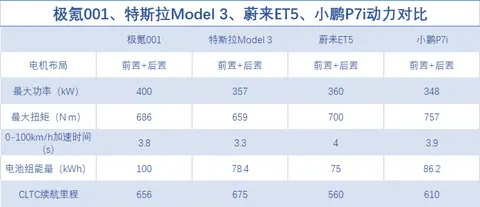 动力及续航层面,同样考虑到四台车的价格,咱们也理应对四台车的表现提出更高的要求。动力层面,极氪001、特斯拉Model 3、蔚来ET5、小鹏P7i都配备了前后双电机,但四台车的动力参数各有优劣,比如极氪001的最大功率全场第一,小鹏P7i的最大扭矩全场第一。在最终的产品呈现上,特斯拉Model 3零百加速时间仅需3.3秒,极氪001为3.8秒,小鹏P7i为3.9秒,蔚来ET5为4秒,四台车的动力都很充沛;
