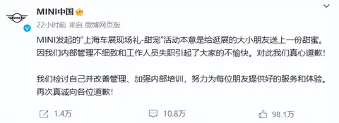 宝马MINI(图片|配置|询价)车展送冰淇淋的事件持续发酵,继昨天宝马一则“写的还不如AI好”的官方回应之后,今天上午9点,宝马再次通过官微发布一则公告,说是再次表示歉意,同时又传达出几个重点信息:发放冰淇淋的方式和渠道,通过MINI App,共有600份;同时还预留了非常少的一部分给现场同事;视频中的那几位老外就是宝马外籍工作人员;礼仪小姐是初入社会的年轻人,大家要多包容。