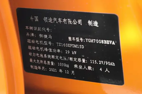 动力方面,御捷朋克多多 2022款搭载了一组电动机,总功率为29kW,总扭矩为110N·m,匹配的电池容量为10.3kwh的磷酸铁锂电池,充电时间为慢充8小时,工信部公布的纯电续航里程为128km,最高车速达到了100km/h。御捷朋克多多 2022款的底盘采用前置前驱的驱动方式,前悬挂形式为麦弗逊式独立悬挂,后悬挂形式为纵臂扭转梁式非独立悬挂,转向类型为电动助力,车体结构为承载式车身,具有出色的操控性和稳定性。充电方面,慢充接口位置在前车标后。
