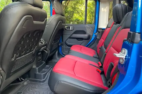 在普通的牧马人Rubicon 392上,唯一的内饰选择是带有青铜色缝线的黑色皮革。与车辆的其他部分相比,它真的有点无聊。在 20 周年纪念版上,Jeep在头枕上安装了带有 Rubicon 392 缝线的亮红色/黑色座椅。红色皮革仪表面板和红色安全带进一步增强了该车的内饰风格。