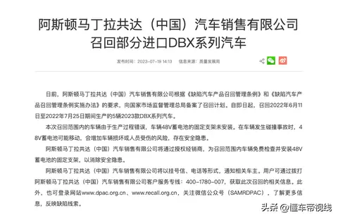 [懂车帝原创 产品] 日前,阿斯顿马丁拉共达(中国)汽车销售有限公司根据《缺陷汽车产品召回管理条例》和《缺陷汽车产品召回管理条例实施办法》的要求,向国家市场监督管理总局备案了召回计划。