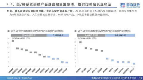 各合资品牌的车型重心存在明确差异。B级及以上多以德系、日系、美系合资品牌为主;A级及以下则以韩系、 法系及德系、日系、美系合资低端品牌为主。自主品牌以A0级和A级车为切入点,造型、工艺升级后,以其性 价比优势冲击同级/低一级合资产品;技术及智能化升级后,以高价值产品体验优势冲击合资产品。