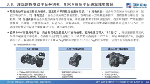 增程电动平台的三种动力模式,满足用户不同维度的用车需求。1)纯电优先:适合可以安装充电桩的家庭,近 似于电动汽车。2)油电混合:适合公共充电方便的家庭,在电池有一定电量的前提下,增程器低功率运行,油 耗低。3)燃油优先则适合没有方便充电条件的环境,此时油耗略低于同级别燃油车。自主研发的1.5T增程器有 更静音、低能耗、低排放的特点。自研五合一电驱动系统,使发电效率和驱动效率的峰值均达到了96.5%,并 通过深度集成式设计使重量减轻10%,体积减小20%。