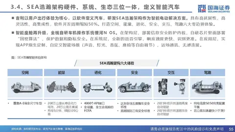 全栈自研EDS电驱系统性能表现突出。前驱180kW永磁电机最大化续航里程,后驱300kW异步感应电机提供 强劲动力输出。感应电驱系统采用了铜转子及激光熔焊技术、双三相拓扑结构逆变器技术,实现电机、齿轮箱 和电机控制器三合一。永磁电驱动系统的系统功率密度行业领先,电机最大效率可达97%。 ICC智能底盘域控制器是中国首个全栈自研智能底盘域控制器。可统一调整控制车身动态,支持FOTA持续进化。 自研智能驾驶系统NAD,打造AQUILA超感系统和ADAM超算平台,预期实现点到点自动驾驶。