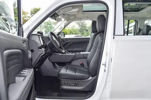 座椅采用仿皮材质包裹,支持主副驾多向调节及前后排靠背角度调节,前排加热、通风功能均有配备,后排地台平整,座椅柔软度适中支撑性强,B柱内侧一边有一个把手,比较照顾老人和小朋友,方正的车身造型也给车内留足了乘坐空间,加上大尺寸的全景天窗和车窗使得车内有较好的通透性,舒适度上也有所增强。