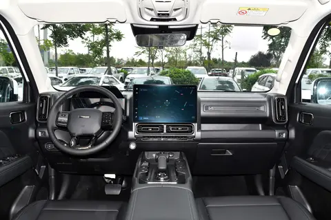 内饰设计和哈弗大狗系列比较相似,也是采用了比较硬朗大气的设计,运用了较多的直线条元素,中岛区域用碳纤维纹理覆盖手感质感都不错,配备了飞机挡把机构和大面积的实体按键,例如空调温度调节、风力调节、后差速锁按键、座椅加热等功能按键,相比全触控屏设计更方便操作,另外驾驶模式采用旋钮式调节,搭载12.3英寸全液晶仪表和14.6英寸中控屏,操作起来的便利性、反应速度、人机交互、语音识别等体验感受都不错。