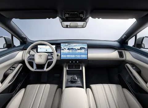 内饰方面,整体布局还是能够看到家族化设计的影子,但中控台明显简洁不少,有着比较强的层次感,提供有三辐式多功能方向盘、全液晶仪表盘、悬浮式中控屏以及电子挡把;中控屏运行的是DiLink 5.0系统,搭载了高通SM7325芯片,性能不输骁龙8155。