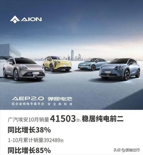 广汽埃安10月销量41503台,同比增长38%,1-10月累计销量392489台,同比增长85%。