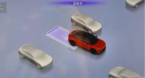 顺利通过路口后,我们终于进入了目的地园区,由于提前录制了泊车路线,此时PPA模式可以无缝链接到代客泊车模式,界面上的灰色图标均为可以泊入的车位。