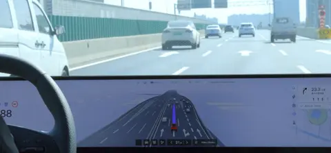 我们还发现,车辆的感知系统不仅识别到了车身平视范围内的车辆,连右侧高架下方道路的车辆也能监测到,冗余度相当高,这也是BEV+Transformer「纯视觉」高阶智驾技术方案的优势之一。