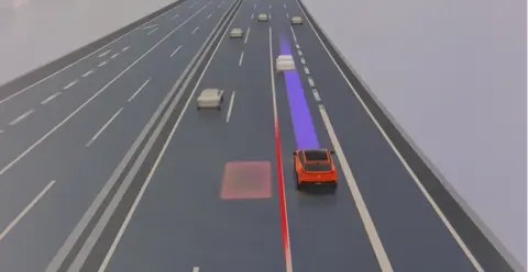 此时旁车道有大车经过,车辆判定不具备变道条件,并在屏幕上进行了红色预警,大车通过后,车辆便插进身位顺利汇入车流。