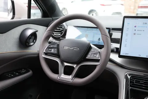 大部分视觉能看到的部位均采用软质材料填充,内饰的颜色为云雾灰,这个色系不见得每个年轻人都喜欢,我个人而言比较喜欢的,比较耐看,对称型的T型中控布局,顶部水平的设计保障了视野的通透性,新能源系列一贯的旋转向日葵大屏比较具有科技感,背部与操控区域大面积的钢琴烤漆黑色面板提升质感,整体设计偏向于成熟稳重风格。