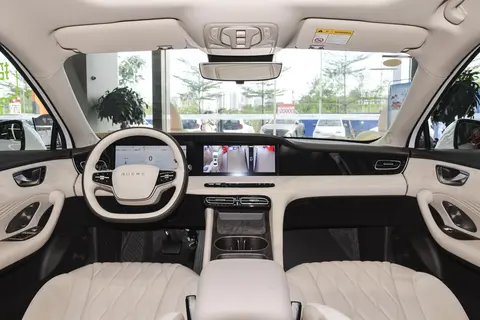 内饰部分:采用粟米的色系元素,与荣威D7 DMH的内饰设计大相径庭,所见的部位均采用白色的软质材料和黑色饰板补充,沙丘式的中控平台,内有12.3英寸的液晶仪表盘+12.3英寸的中控屏,科技感的氛围较足,但视野的通透性也会受到一定的影响,建议驾驶员抬高座椅高度来适应。双幅式的真皮方向盘支持上下+前后调节,外边缘用黑色的皮质包裹,更为耐脏,后方则是一体式的怀挡设计,内饰设计整体较为温馨。