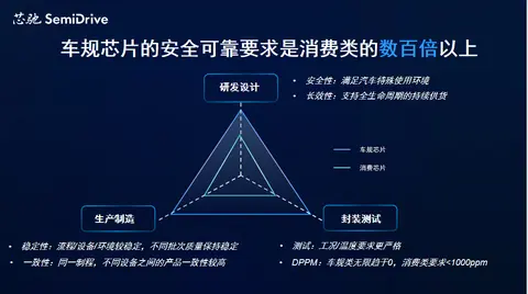 我们为研发车规芯片付出了很多努力,以确保其质量。车规级芯片的容错率是消费级芯片的几百分之一。在汽车领域,我们追求百万颗芯片的PPM小于1甚至无限趋于0。