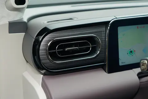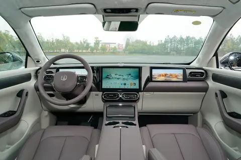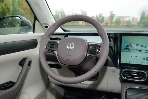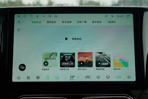 内饰方面采用了T字型布局,强调了空间感。色彩搭配上使用了淡雅的色调,营造出一种清新的氛围。车内的材料除了软性材质包裹外,还加入了镀铬装饰和木纹装饰板,增加了内饰的精致感。空调出风口采用了横向设计,与中控屏幕的直线形状相呼应。方向盘采用了简洁的两辐设计,中间镶嵌着零跑的品牌标志,周围设有多功能按键,方便驾驶者操作各种功能。