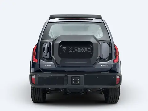在外观方面,根据此前的官图形成了前脸部分采用了前卫的设计理念,并没有盲目的跟随友商的设计,显示了长安历来的态度,极具科技感的封死车鼻,左右两侧有着C字形日行灯带包裹的大灯组,前保险杠部分加入了大尺寸,下格栅显示了有内燃机车型的定位。在车身侧面标准的方盒子造型,加入了一丝未来感。虽然在CD柱的处理有些像哈弗狗系列或是宝马XM,但隐藏式车门把手,隐藏式的ABC柱等元素还是相当的动感,侧裙处还有着额外的凹陷加入了粗壮的塑料装饰条,厚实的车门踏板,AT轮胎,较高的离地间隙和巨大的行李架也显示了硬派的属性。