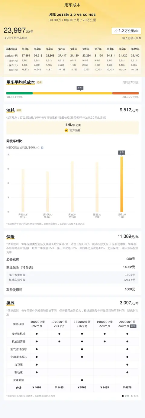 这款车系的用车成本包括:年均油耗9512元/年,官方油耗11.6L/百公里,年均保险费11389元/年,年均保养费3097元/年,十年平均用车成本23997元/年。