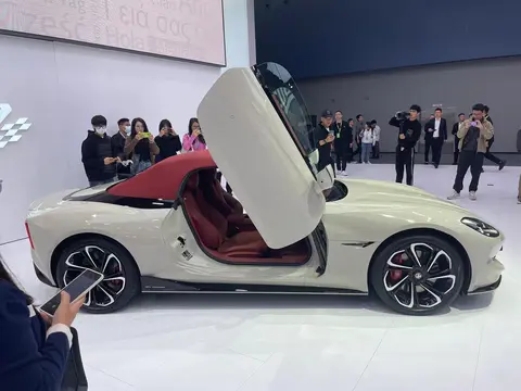 侧面造型方面,新车采用了红色软顶敞篷设计,有点致敬1956款MGA以及1967款MGB的感觉,无框车门以及剪刀门也没有缺席,进一步增强了运动感;轮毂采用的是多幅式刀锋造型,与之搭配的是红色卡钳。