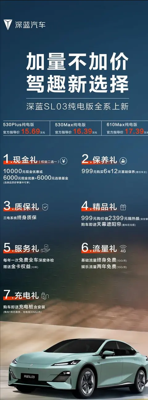 日前,2024款深蓝SL03(图片|配置|询价)纯电版正式上市,新车推出三款车型可选,售价区间为15.69-17.39万元。此次,新车 主要是降低了购车门槛,除了满足更多用户群体,也提升了产品竞争力。